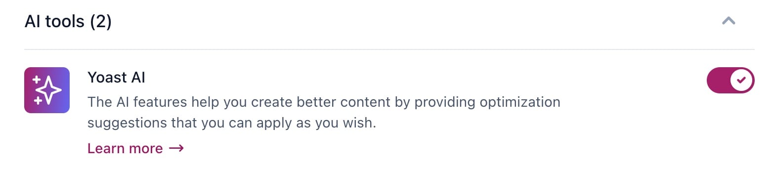 | I cannot find the Yoast Generate or Yoast AI Optimize features in WordPress | You are using the free version of Yoast SEO or have not upgraded to the latest version of Yoast SEO Premium and/or Yoast SEO WooCommerce | If you want to use the AI features for posts, pages, categories and tags, upgrade to Yoast SEO Premium and make sure you have updated to the latest version If you want to use Yoast Generate for products, upgrade to Yoast SEO Premium and Yoast SEO WooCommerce and make sure you have updated to the latest version |