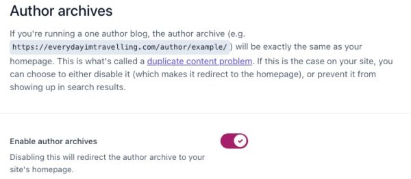 In the Advanced settings, you will find menu items for three different types of archives: author archives, date archives, and format archives. At the top of the page, you’ll see the Enable archives toggle. If you disable the archives, the archive pages will not show up in the search engine results.
