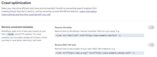 The next menu item is Crawl optimization. It’s only available if you have Yoast SEO Premium. It is a list of toggles which allow you to remove items from being crawled by search engines. These toggles are disabled by default so you can decide what gets crawled. This feature makes your site more efficient and reduces your carbon footprint.