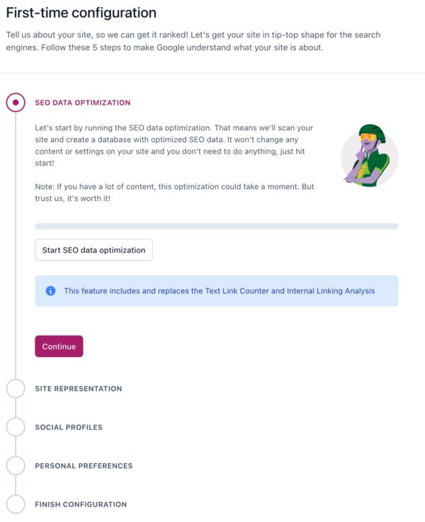 In the First-time configuration tab, you can configure Yoast SEO. We advise you to complete this configuration as soon as possible. You can also return or edit the data later.