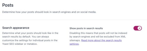 In the settings for categories and tags, you can determine whether you want search engines to show these pages in the search results. You can also alter the templates of the SEO title, meta description, and social media appearance templates for these taxonomies.
