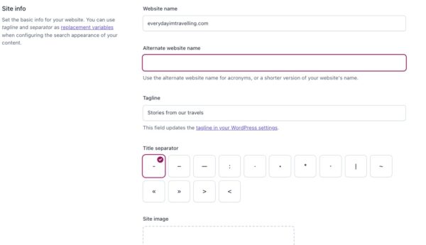 In the Site info section, you can set the basic info for your site, such as the name of your website, an alternate website name , the tagline, a separator, and an image.