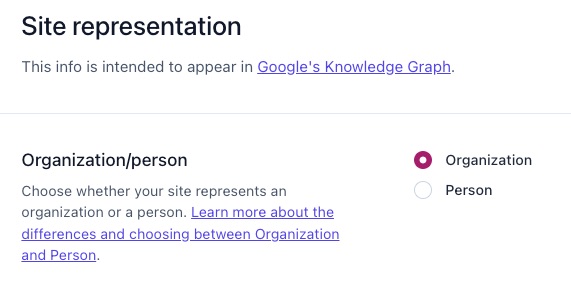 Here you can indicate whether your site represents an organization or a person. We make sure to transform this information into structured data search engines can easily understand. As a result, your content will display better in the search results.