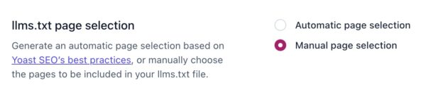 In the llms.txt menu, you can enable and customize the llms.txt file feature. When you enable llm.txt, you can choose between automatic and manual page selection. This allows you to choose what pages appear in the llms.txt file.