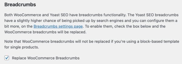 If you have Yoast SEO breadcrumbs enabled, we recommend ticking Replace WooCommerce Breadcrumbs.
