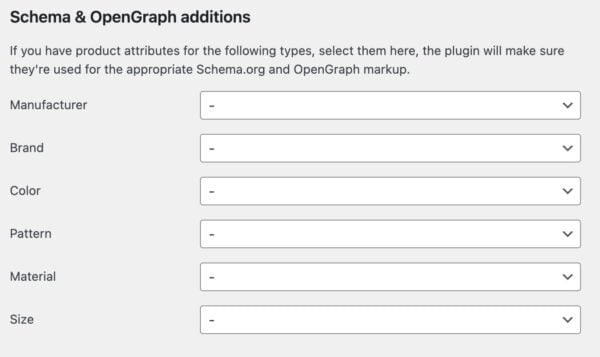 However, to make Yoast WooCommerce SEO output these Schema properties, you will need to create attributes in WooCommerce first. Learn how to do that in this help article How to add custom attributes to your products. After creating them, you can select them in the dropdown menus of the Schema & OpenGraph additions.