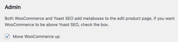 The second part of the settings, below Admin, allows you to change the order of the WooCommerce and Yoast SEO meta boxes. If you want the WooCommerce meta box to show up above the Yoast SEO meta box, tick the box Move WooCommerce up.