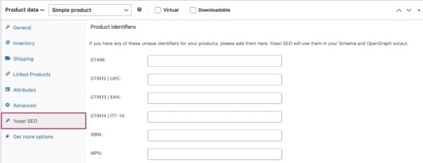 If your products have any of the listed unique identifiers you can add them in the appropriate field. Yoast SEO will use them in your Schema and OpenGraph output.