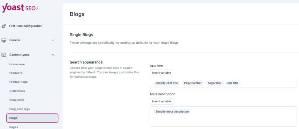 In the Search appearance section of the settings, you can set default templates for the SEO title and meta description for the various content types. You can also use snippet variables to create default SEO title and meta descriptions. However, remember that these templates should be a backup. The best way to add the SEO title and the meta description is when you edit a single page.