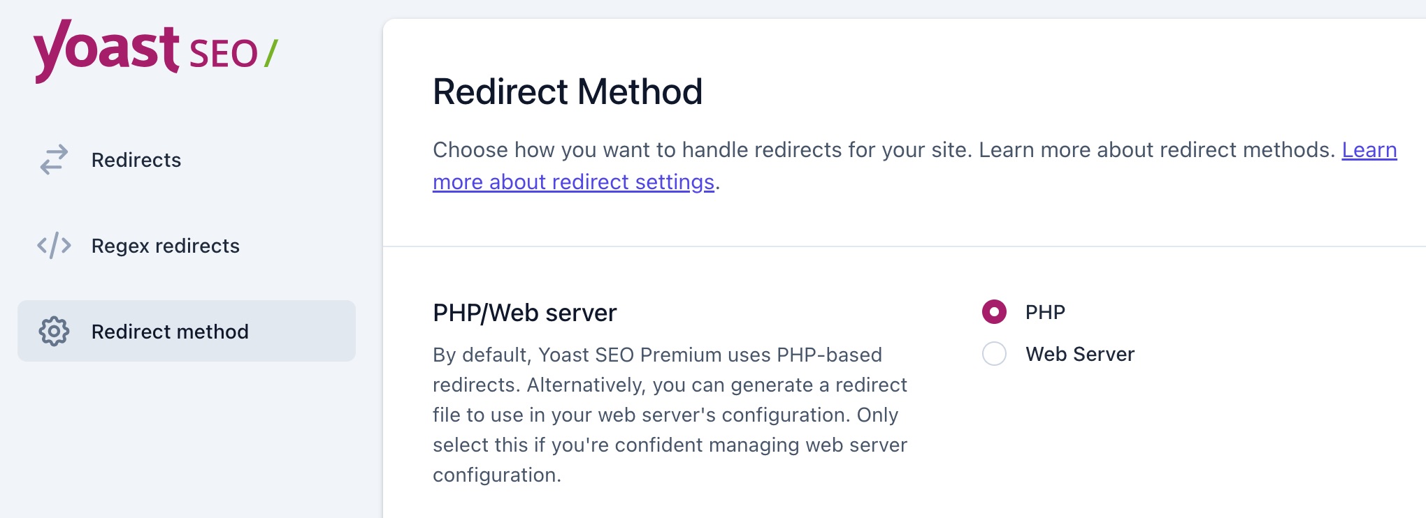 The default setting for Yoast SEO Premium is that PHP handles your redirects. This requires no work on your end, except for entering the redirects. If you only have a few redirects your server will be able to handle them quickly using PHP redirections. However, if you have a lot of redirects (the exact number depends on your server), they may slow PHP down. In that case, it can be useful to let your web server take care of the redirects.