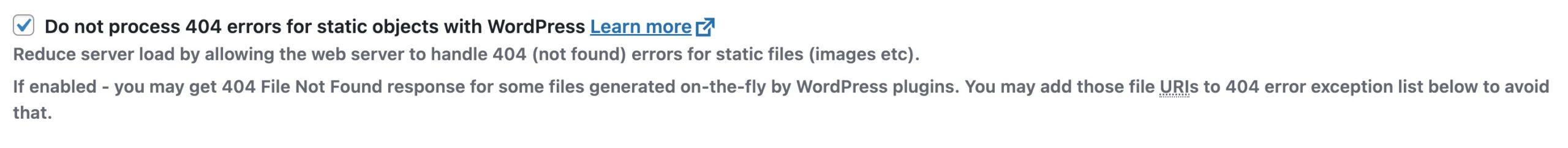 - If you’ve ticked Do not process 404 errors for static objects with WordPress, add the code in step 2