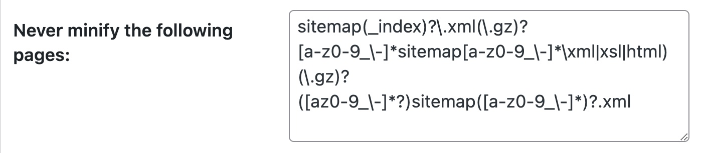 - Under Never minify the following pages, add the code below