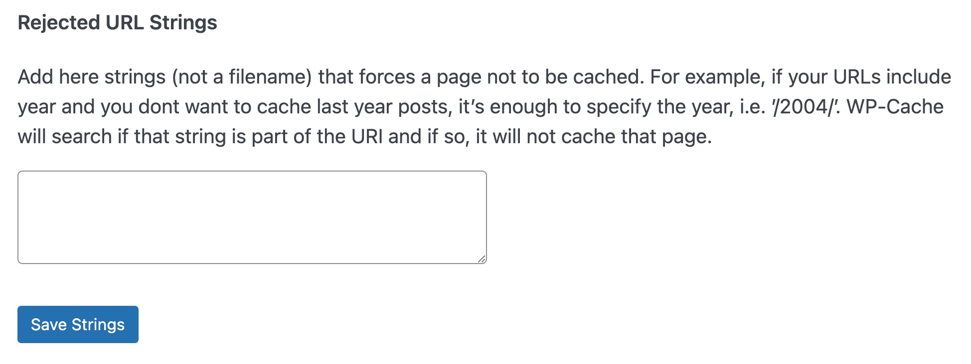 - Under Never Cache URL(s), add the following code