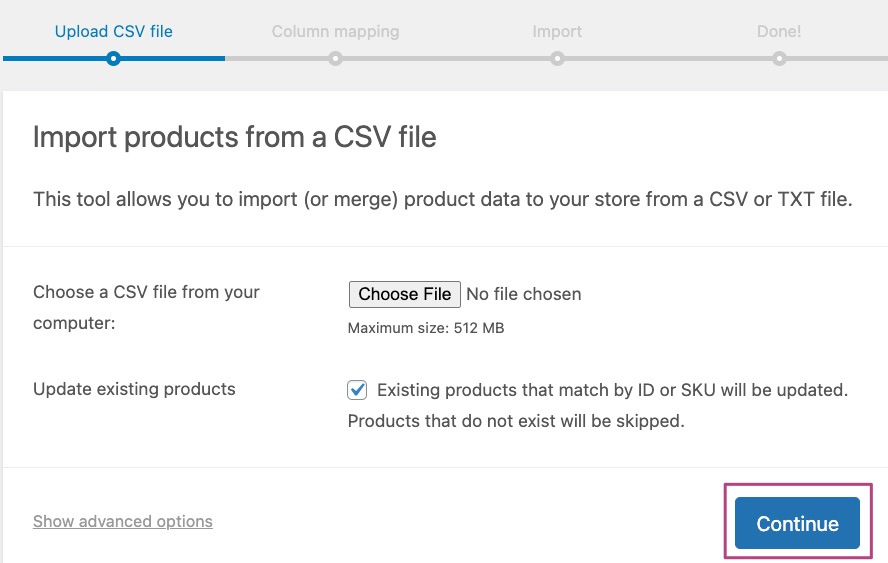 - If you’re updating existing products, tick the box Existing products that match by ID or SKU will be updated.