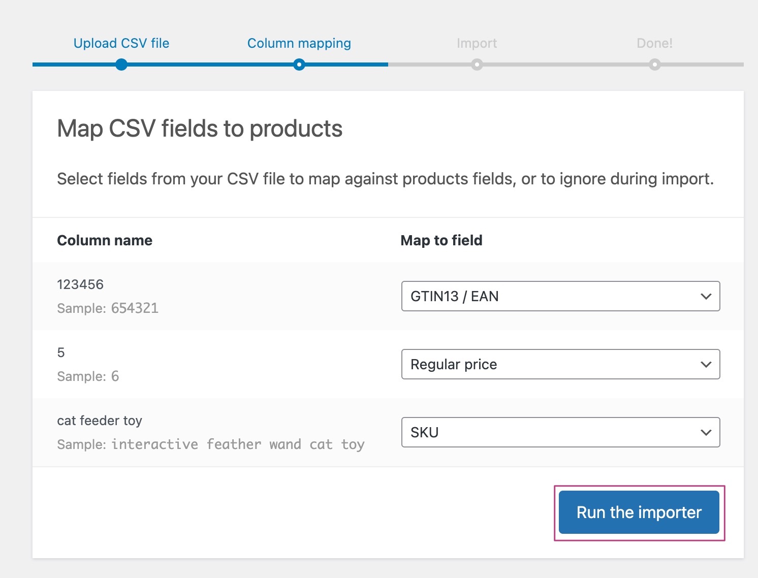 To add the global identifiers to your products in bulk and have them automatically described with the correct schema, follow the steps below. You also need a CSV or TXT file containing your product ID, SKU and new global identifiers in separate columns.
