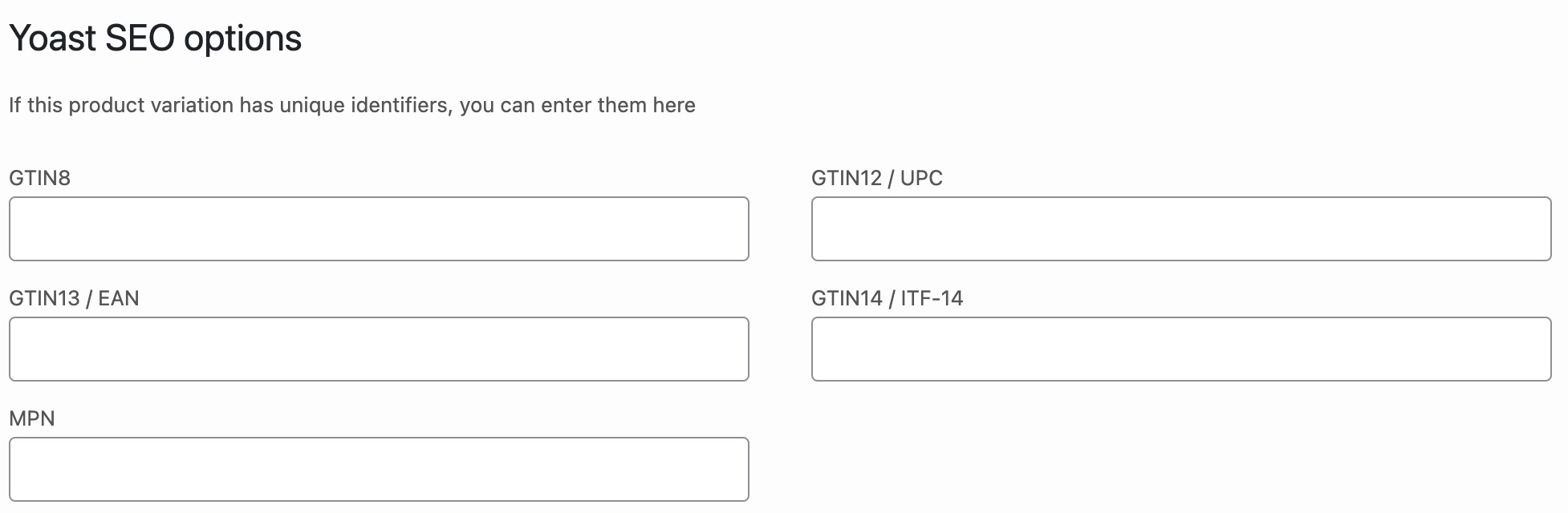 The most common product identifiers are GTINs and MPN. If you use Yoast WooCommerce SEO, you will see the following identifiers: