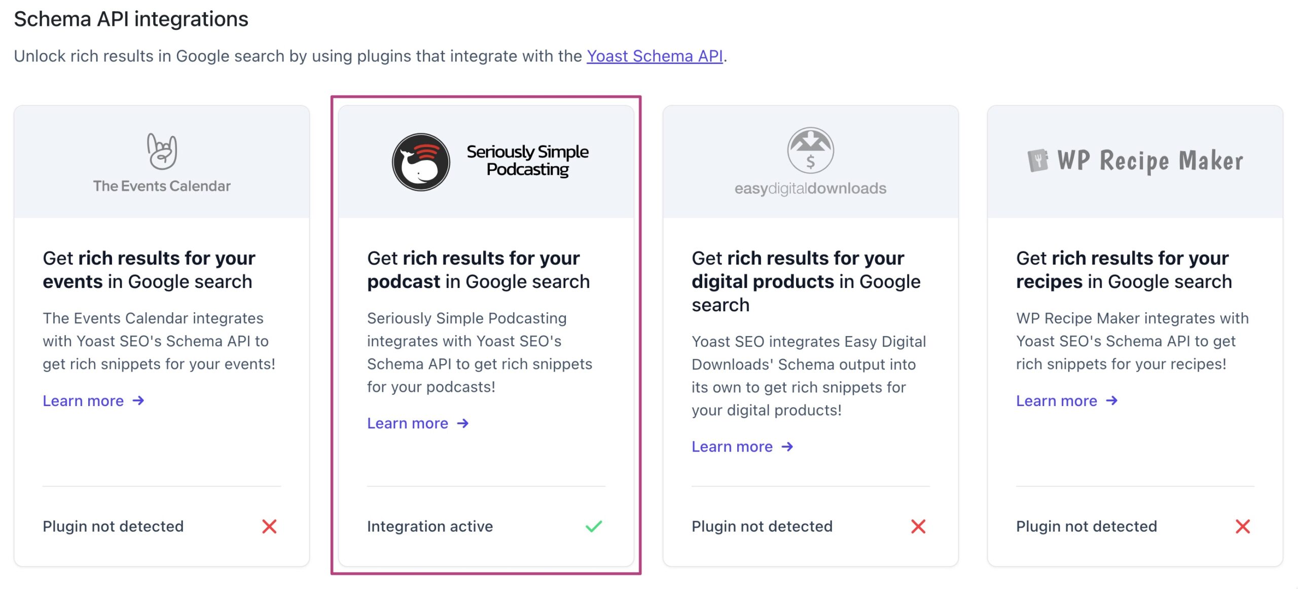 - Under Schema API integrations, check that Seriously Simple Podcasting is active