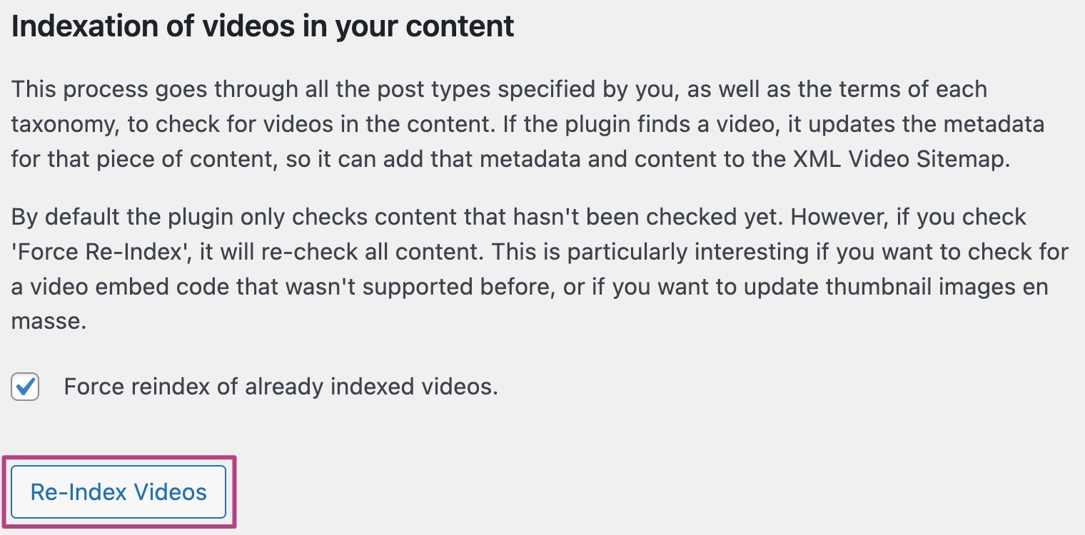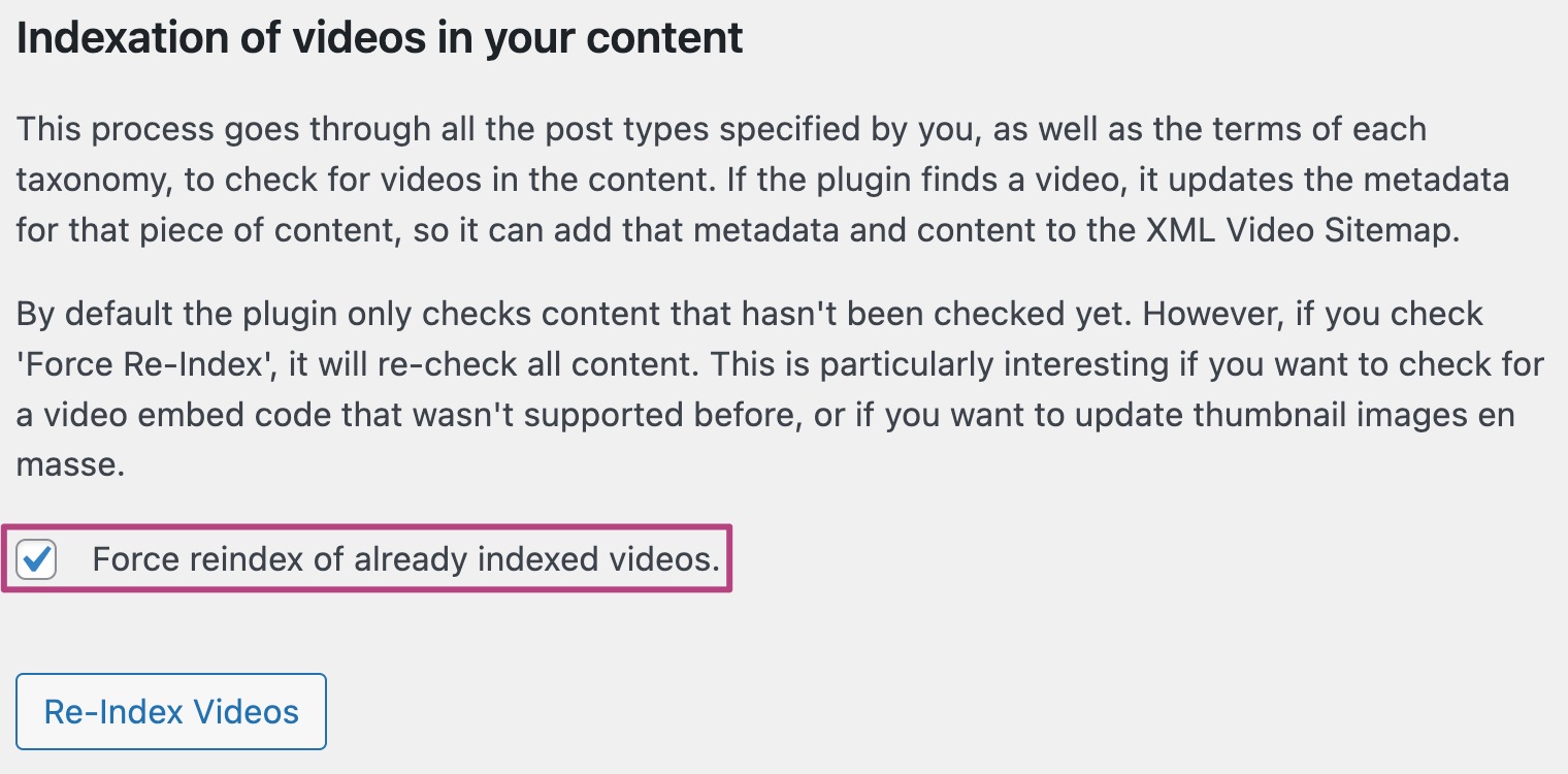- Under Indexation of videos in your content, check the box Force reindex of already indexed videos