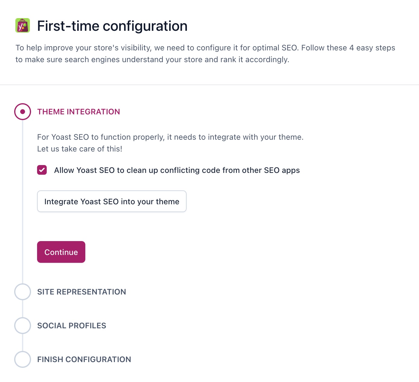 With Yoast SEO installed, you can now start optimizing your store! Finish the First time configuration and read the Quick start guide for Yoast SEO for Shopify to start ranking.