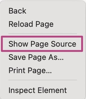 If you click on an element on the page, such as an image or a link, you will get different options. - In the dropdown menu, click Show Page Source