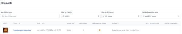In the overview, you can see the content’s image, title, date, visiblity, SEO score, Readability score, SEO title, meta description and focus keyphrase.