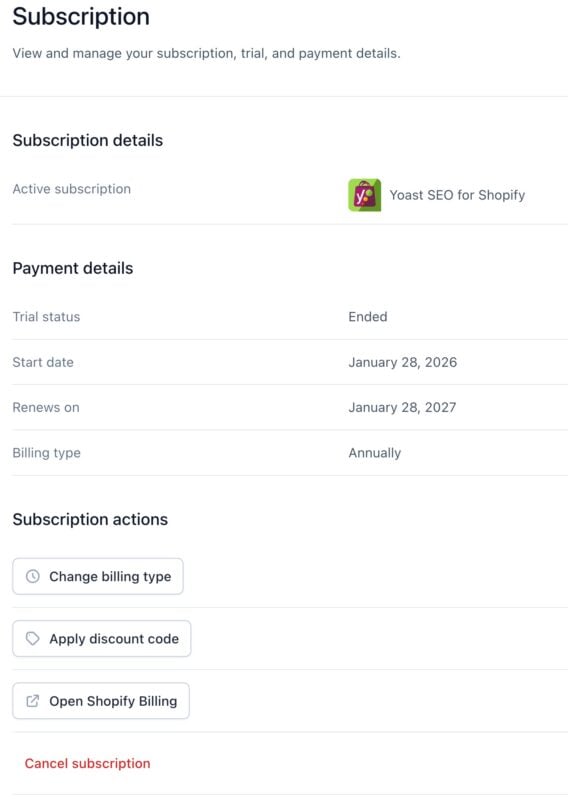 Under Cancel subscription, you can end and cancel your Yoast SEO for Shopify subscription. Please note that canceling the subscription is a two-step process: follow the instructions in our guide on How to uninstall Yoast SEO for Shopify.