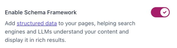 Under Enable Schema Framework, you can switch the toggle to on or off. If the toggle is on, Yoast SEO builds a single, connected Schema graph for your site. We strongly advise you to keep this toggle on.